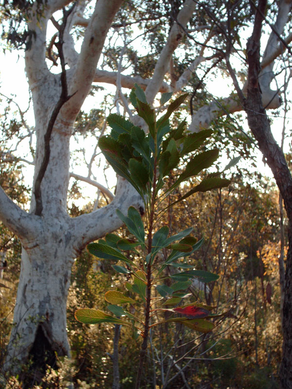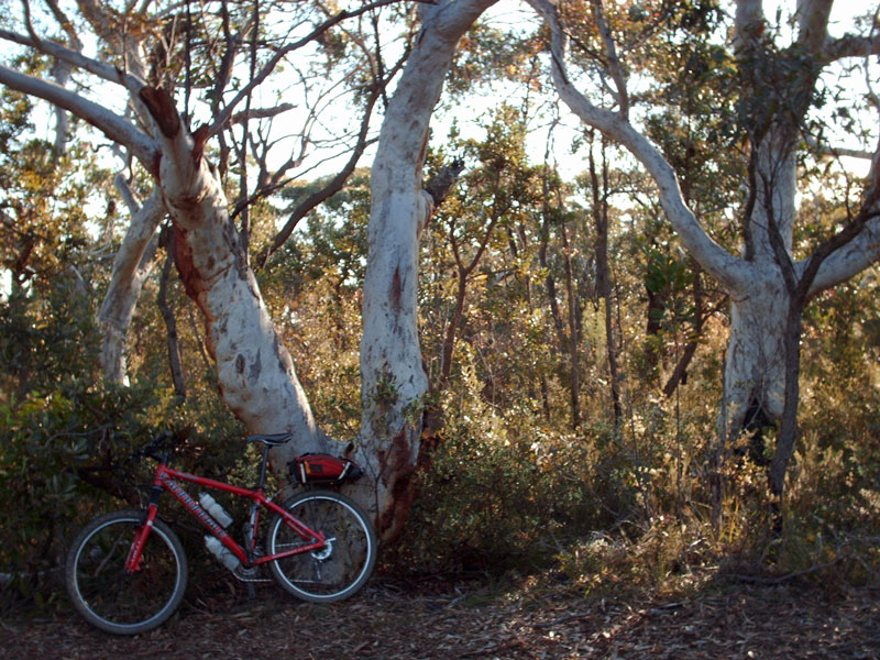 Despite the chill, it was a good ride along this trail and I had a moment with a Wallaby— about 500m before the gate at the 10C trail turn-off (31km). The wallaby watched me long enough to get my camera out, though not long enough for a photo, so I snapped a pic of some trees (my bike in the left foreground) and a waratah (no flower).