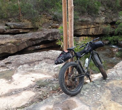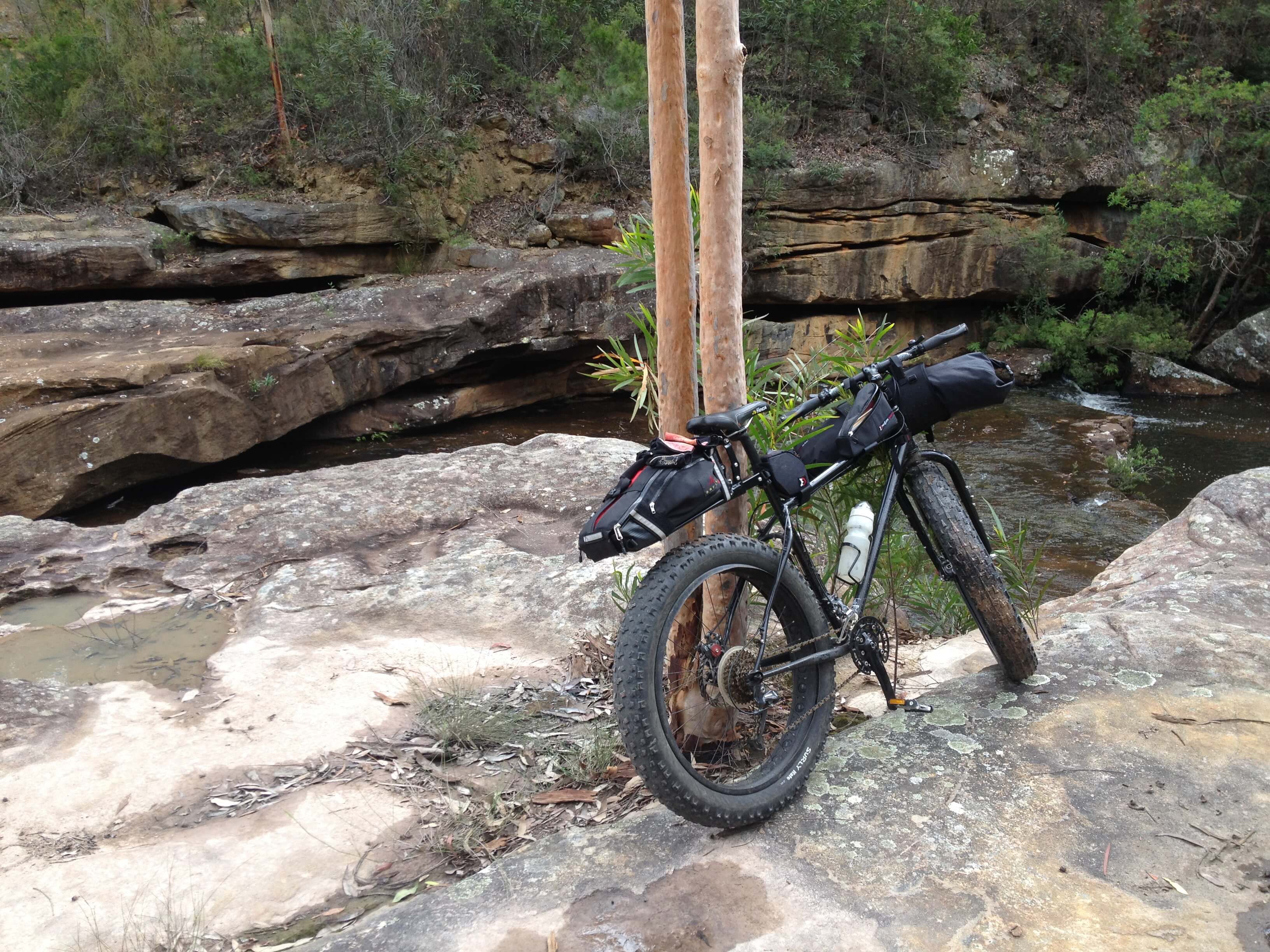 For this trip, we started at the Appin Road end of the 10B fire trail, and the plan was to ride around 10km in and turn back. I was on my Surly Pugsly, accompanied by three moutnain bikes (two Trek Skye 29ers and an older 26 bike). I attempted to take cues from these friends regarding when we should turn back, trying to ensure we did not push to far. We seemed to be doing well, and kept riding towards Stokes Creek.
