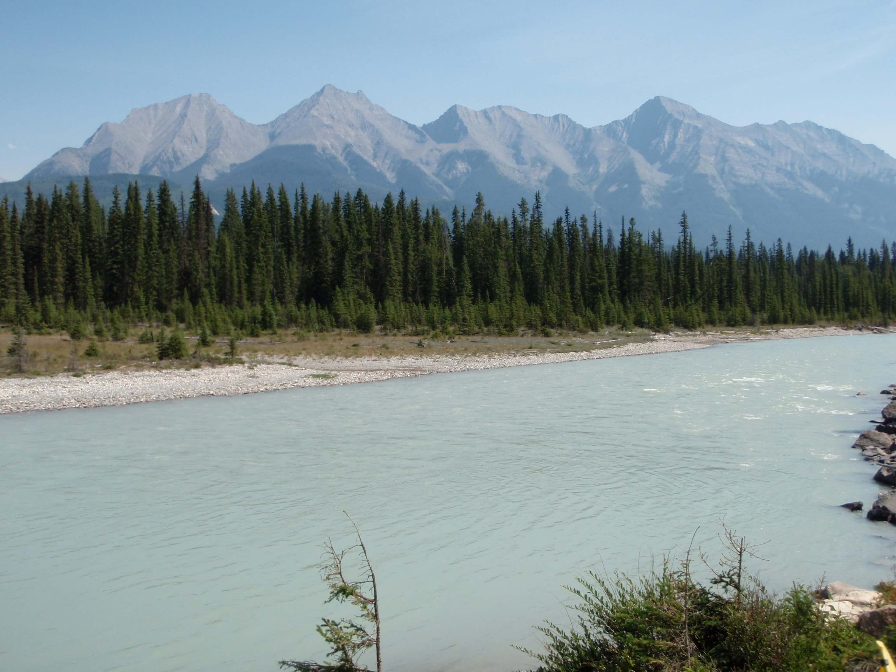 Following the 300m of downhill most of the rest of the day was steady climbing. It was long and challenging mostly due to the heat. It also seemed to go on and on. Respite came with looking at not just the mountains. The Kootenay and Vermillion Rivers' were a site in themselves. During the day I crossed paths a couple times with two cyclists from Portugal. They were on a Banff-Jasper-Radium-Banff loop.
