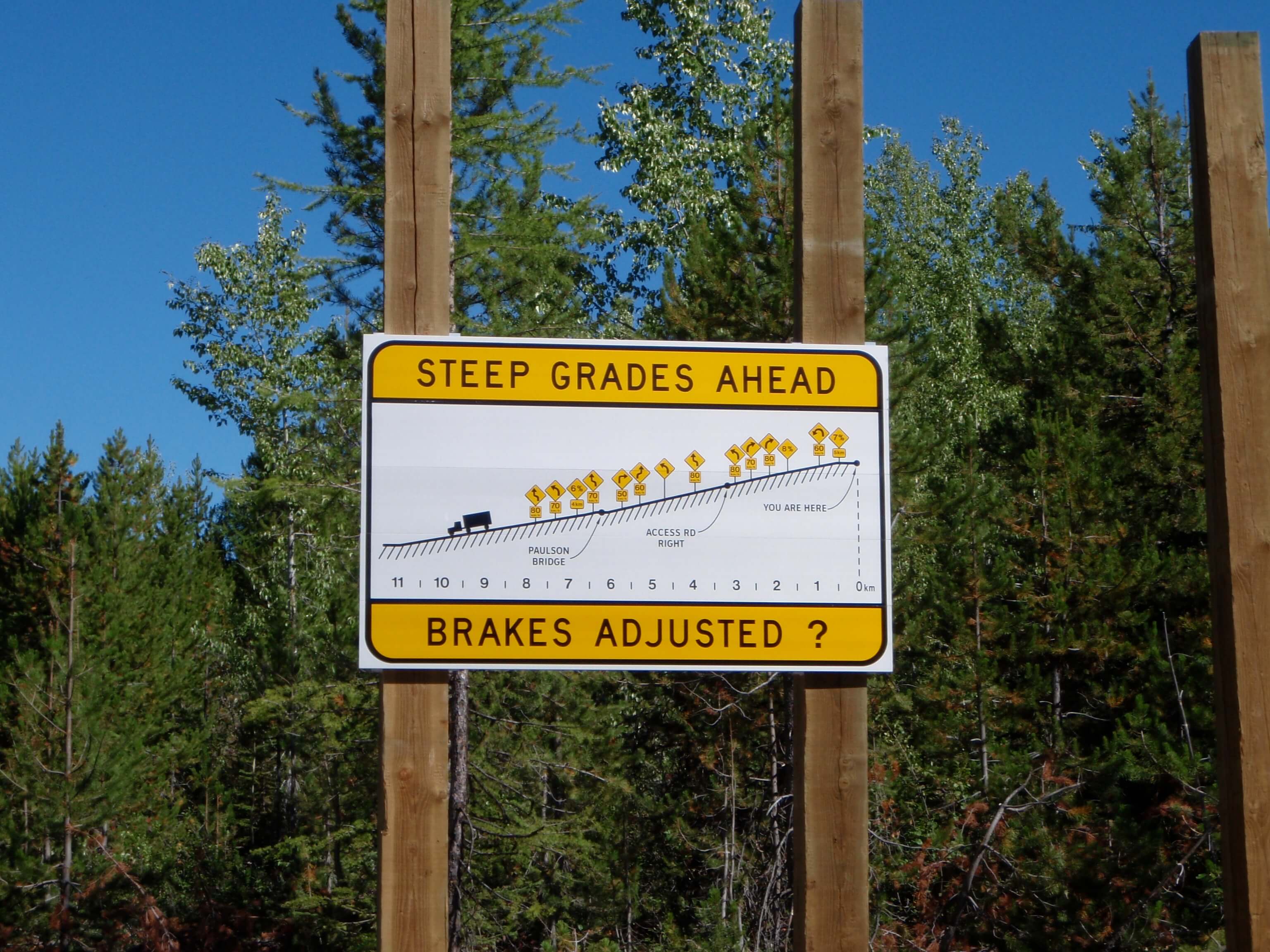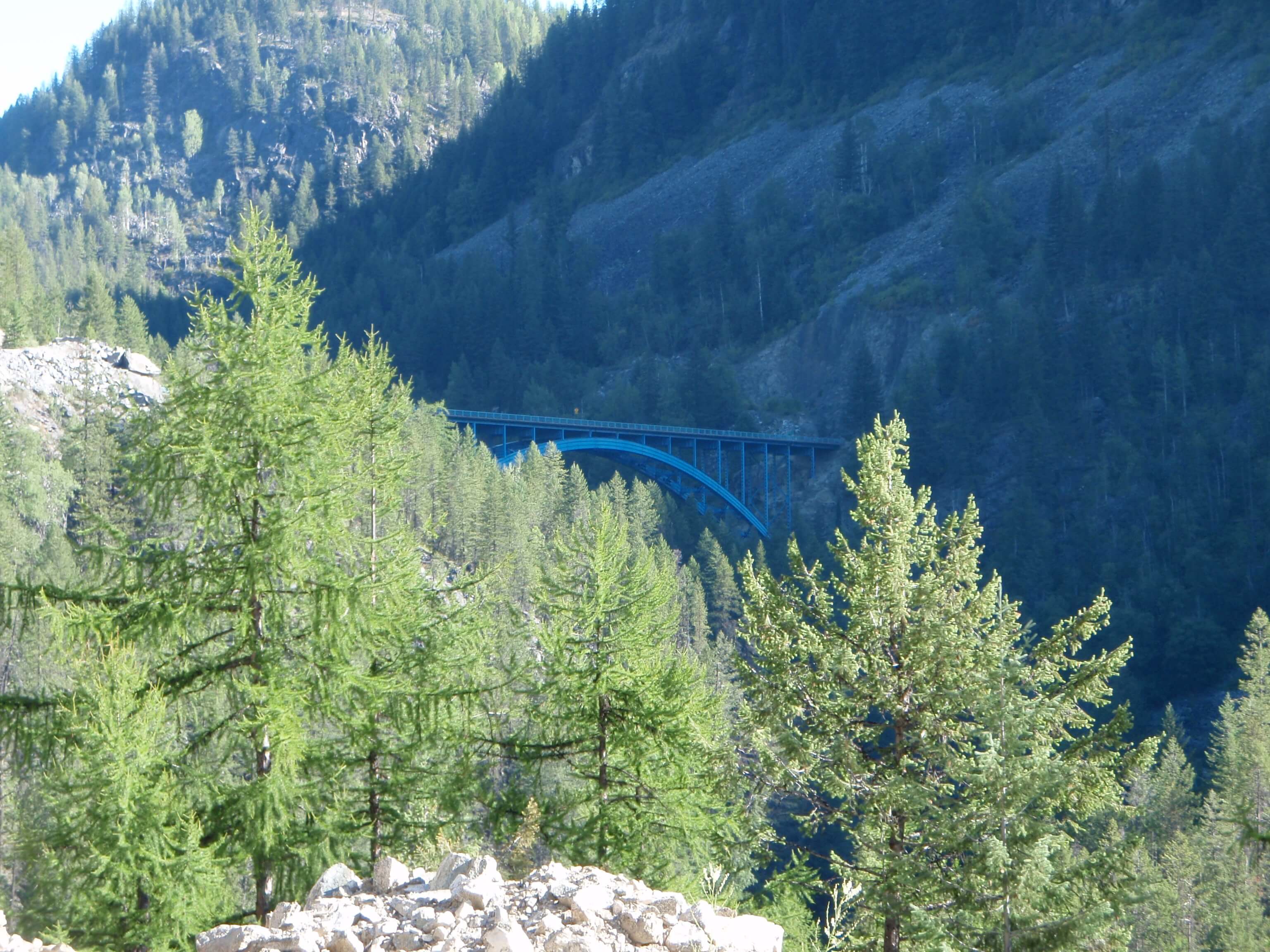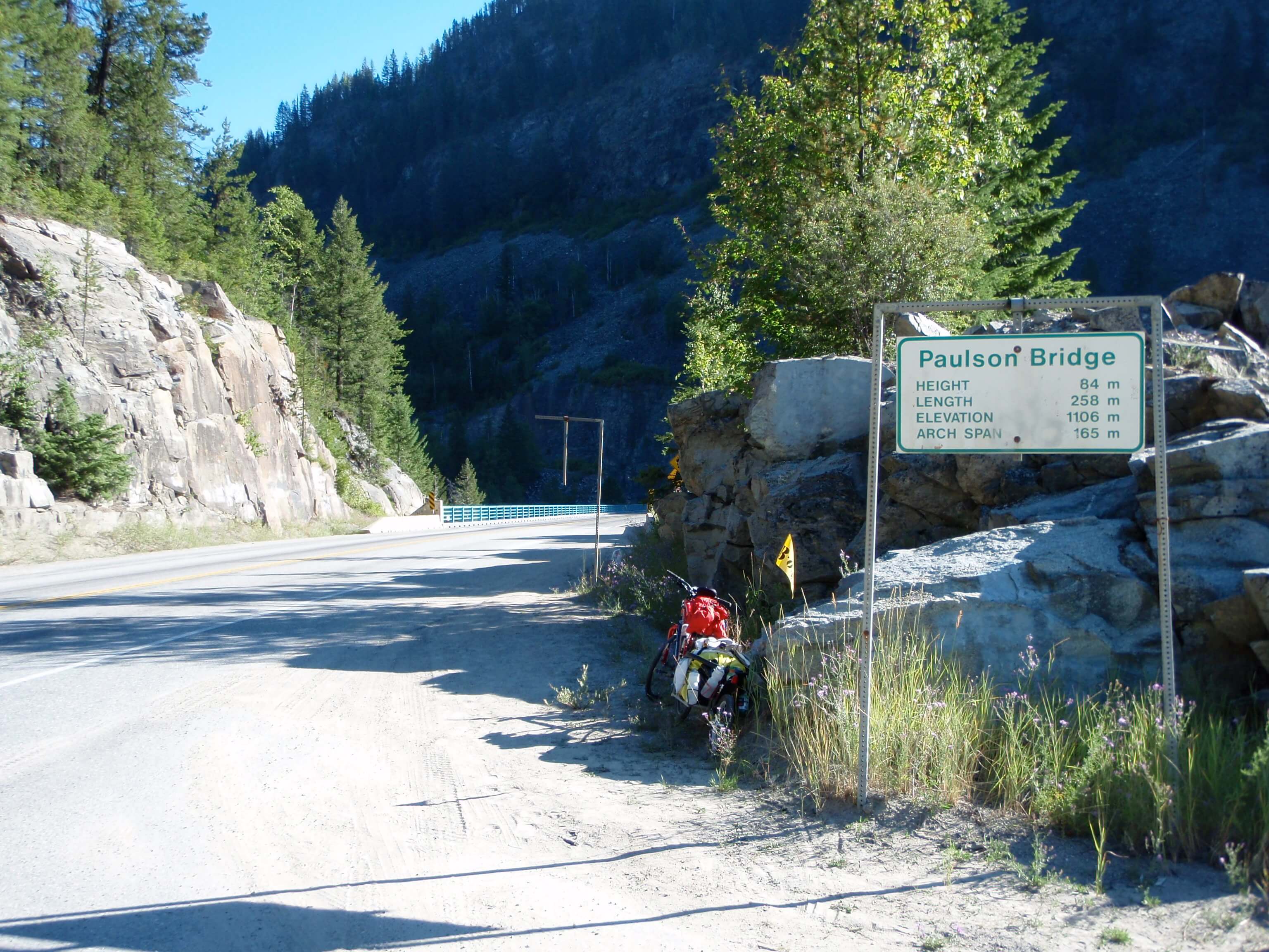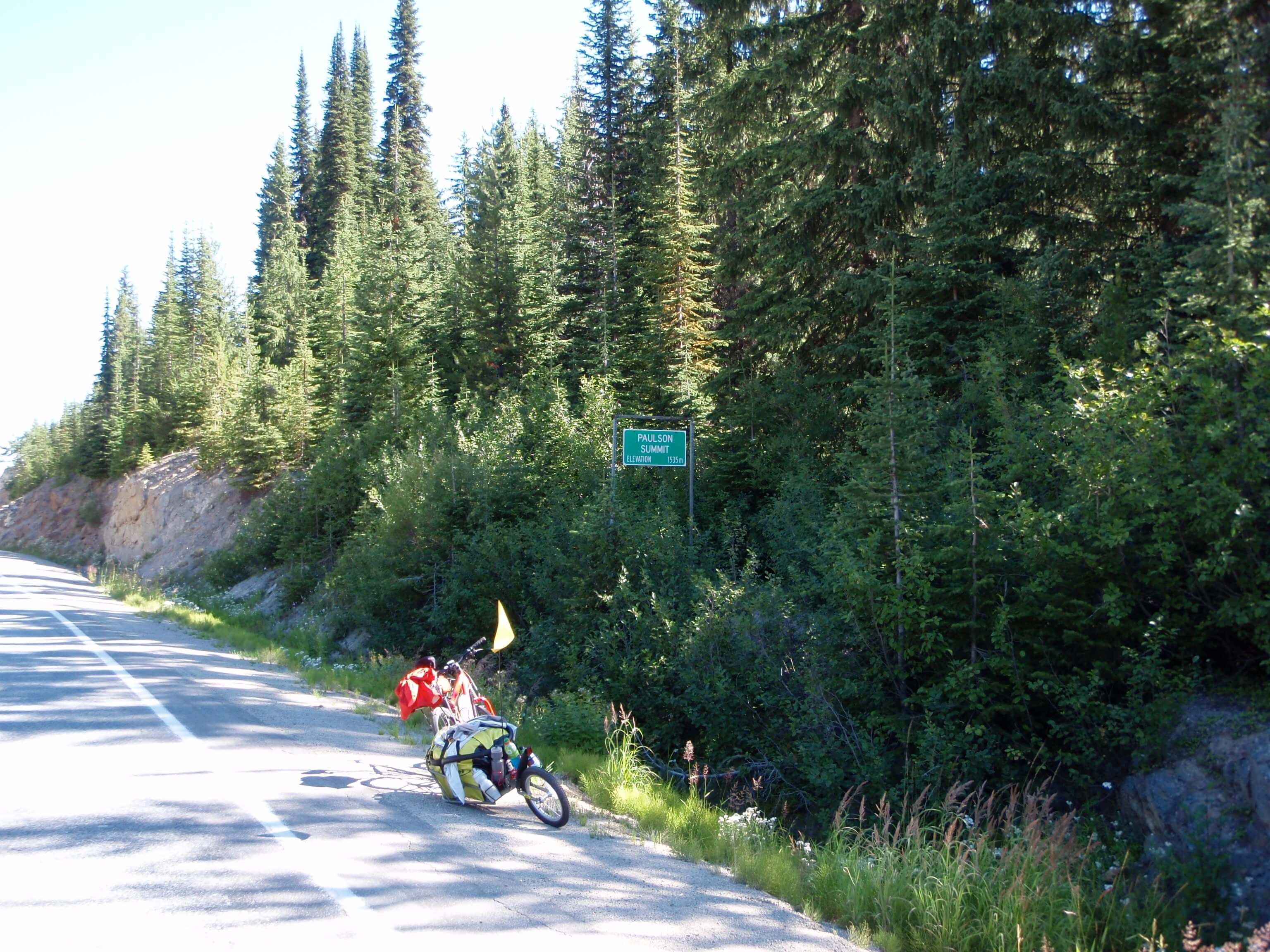 I took a quick break at the McRae Creek rest area, and had a chat with a guy from Alberta who slept there in his car after being unable to get accommodation for the night in Christina Lake. He was woken by a noisy squirrel who was not very happy with presence. I pushed on at 7:20, finding the grade to be quite manageable. The roadside tress and slope provided a good deal of morning shade making for a more pleasant ride. The grade did get up to 8%, though after passing Paulson Bridge (1106m) at 9am (34km, 1 hr 55 mins) they did ease somewhat for the remaining 12km to the summit and heading for the 1535m summit (3hrs).